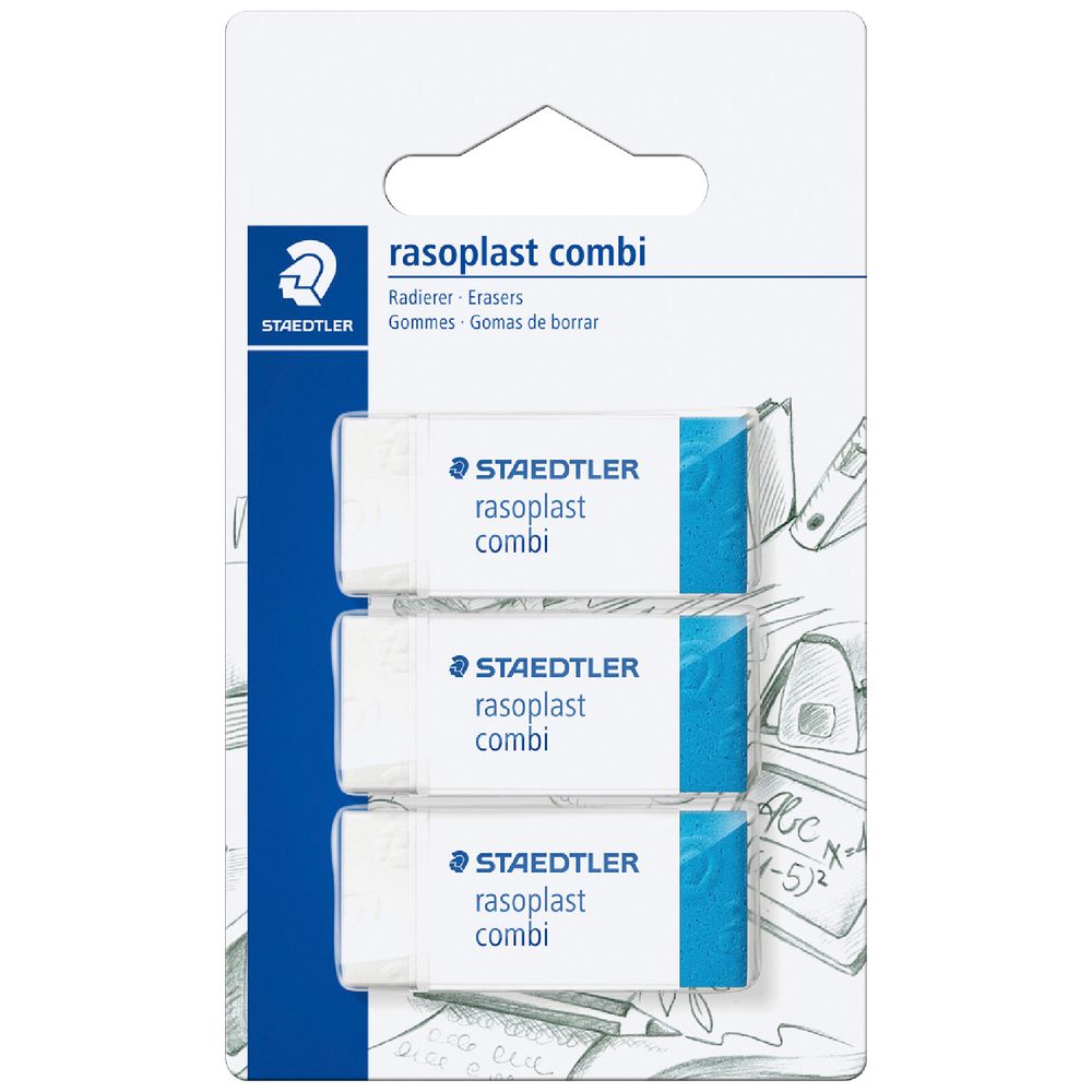 The Staedtler Rasoplast Combi Erasers are perfect for erasing ink and lead. The blue section of the erasers is a great way to remove mistakes in ink from paper, and the white end will erase lead.